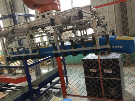 將產品通過進料輸送帶輸送進料,機器人及夾具到產品上方,抓取產品后移動到棧板位,按事先輸入的碼垛形式進行產品碼放,碼放完成后自動輸送到纏繞工位,纏繞完成后叉車運走。