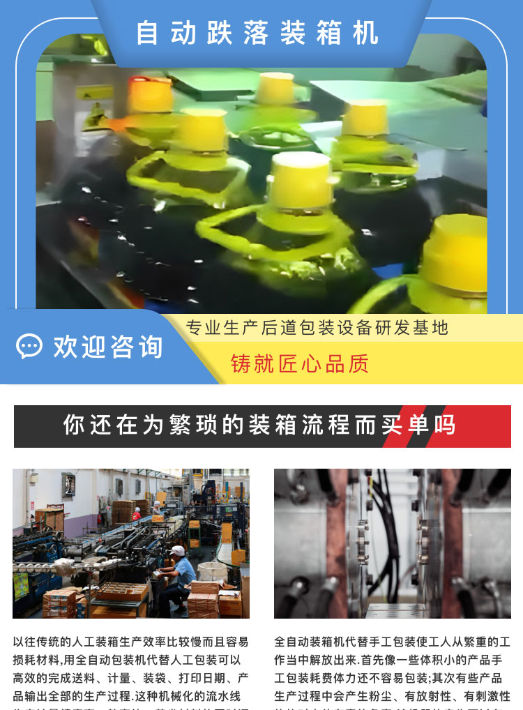 介紹:自動跌落裝箱機(jī)。專業(yè)生產(chǎn)后道包裝設(shè)備研發(fā)基地鑄就匠心品質(zhì)。你還在為繁瑣的裝箱流程而買單嗎?以往傳統(tǒng)的人工裝箱生產(chǎn)效率比較慢而且容易損耗材料,用全自動包裝機(jī)代替人工包裝可以的完成送料、計(jì)量、裝袋、打印日期、產(chǎn)品輸出全部的生產(chǎn)過程。這種機(jī)械化的流水線生產(chǎn)計(jì)量精度高、效率快、節(jié)省材料的同時(shí)還減少了人工成本。 全自動裝箱機(jī)代替手工包裝使工人從繁重的工作當(dāng)中解放出來。像一些體積小的產(chǎn)品手工包裝耗費(fèi)體力還不容易包裝;其次有些產(chǎn)品生產(chǎn)過程中會產(chǎn)生粉塵、有放射性、有刺激性的的對人體有毒的危害。該機(jī)器的產(chǎn)生可以的解決這些問題。 產(chǎn)品別稱:裝箱機(jī)、裝盒機(jī)、自動裝箱機(jī)、自動裝盒機(jī)、跌落式裝箱機(jī)、側(cè)推式裝箱機(jī)、抓舉式裝箱機(jī)、機(jī)器人裝箱機(jī)、一片式裹包機(jī)、食用油跌落式裝箱機(jī)。