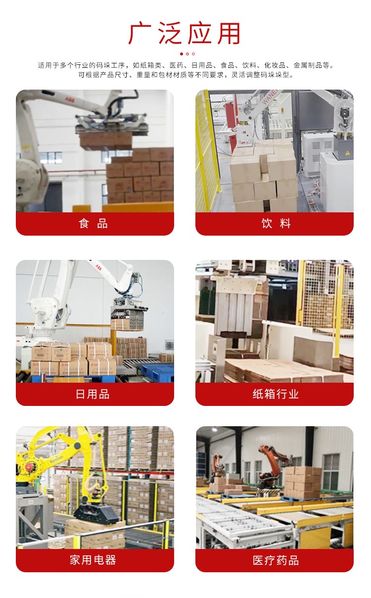小型機械手碼垛機是一種智能化包裝設備,通常由機械手臂、控制系統、傳感器和夾具組成。它可以根據預設程序自動抓取、碼垛和放置不同形狀和尺寸的產品,實現、精準的包裝操作。這種機器人碼垛機適用于小規模生產線或空間有限的場所,能夠提高生產效率,降低人力成本,并確保包裝質量的一致性和穩定性。由于其靈活性和智能化特點,小型機械手碼垛機在多個行業,如紙箱、食品、醫藥等領域得到廣泛應用。